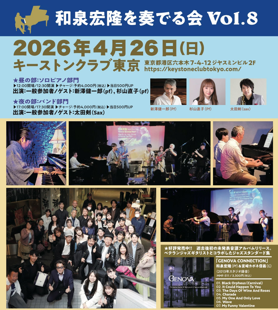 2021 年 4 月 26 日に急逝したピアニスト和泉宏隆の追悼イベント「和泉宏隆を偲ぶ会」の一環として始まった「和泉宏隆を奏でる会」ですが、ファンの皆さんの熱いサポートに支えられ第8弾を和泉の命日に開催することになりました。今回は「奏でる会」の古巣、キーストンクラブ東京に戻って、参加者の皆さんには和泉が親しんだハンブルク・スタインウェイ・ピアノのサウンドをお楽しみいただきながら、お馴染みのこのステージでお気に入りの和泉ナンバーを奏でていただきます。皆様のご参加をお待ちしています。どうぞよろしくお願いします!!